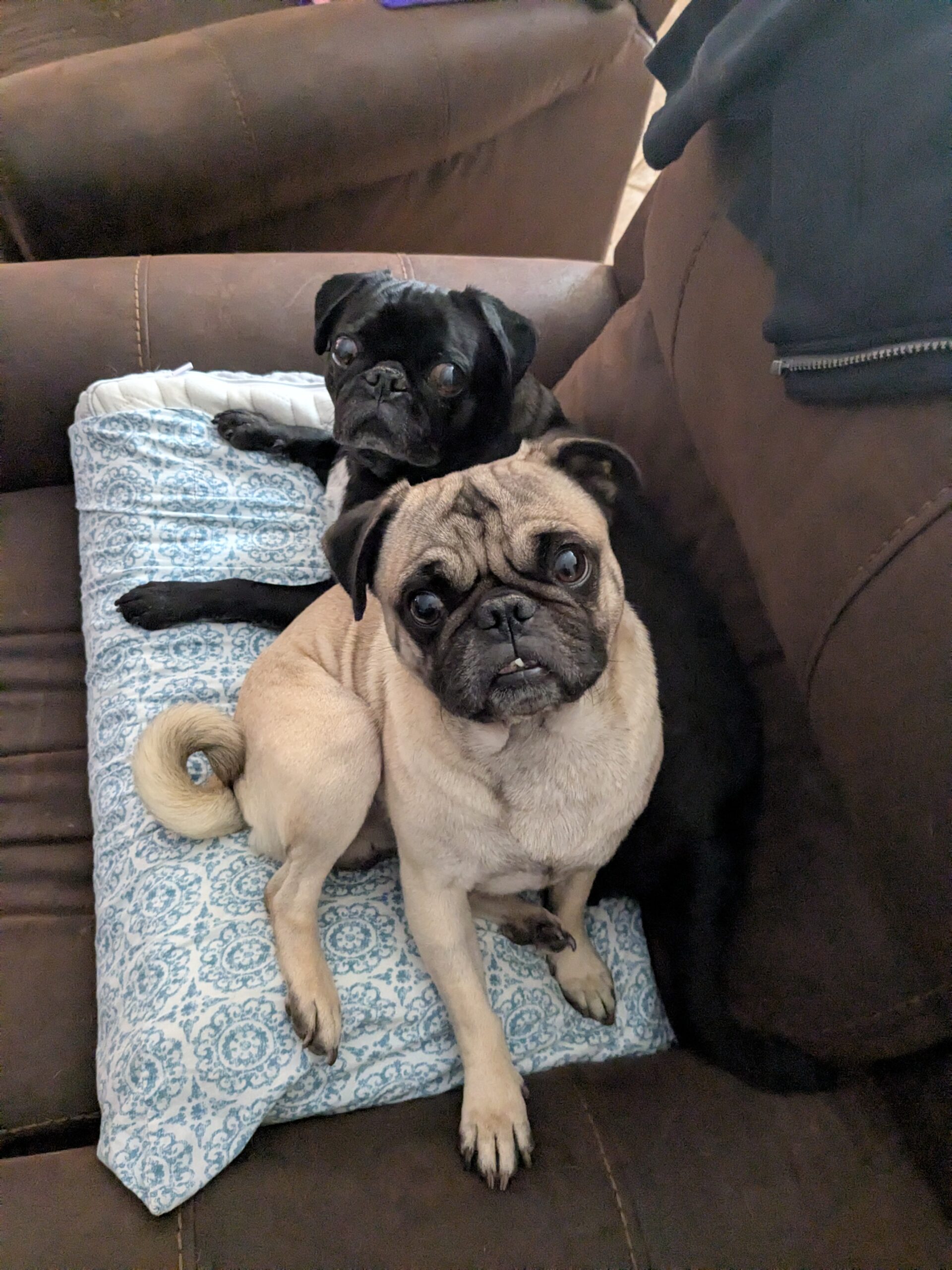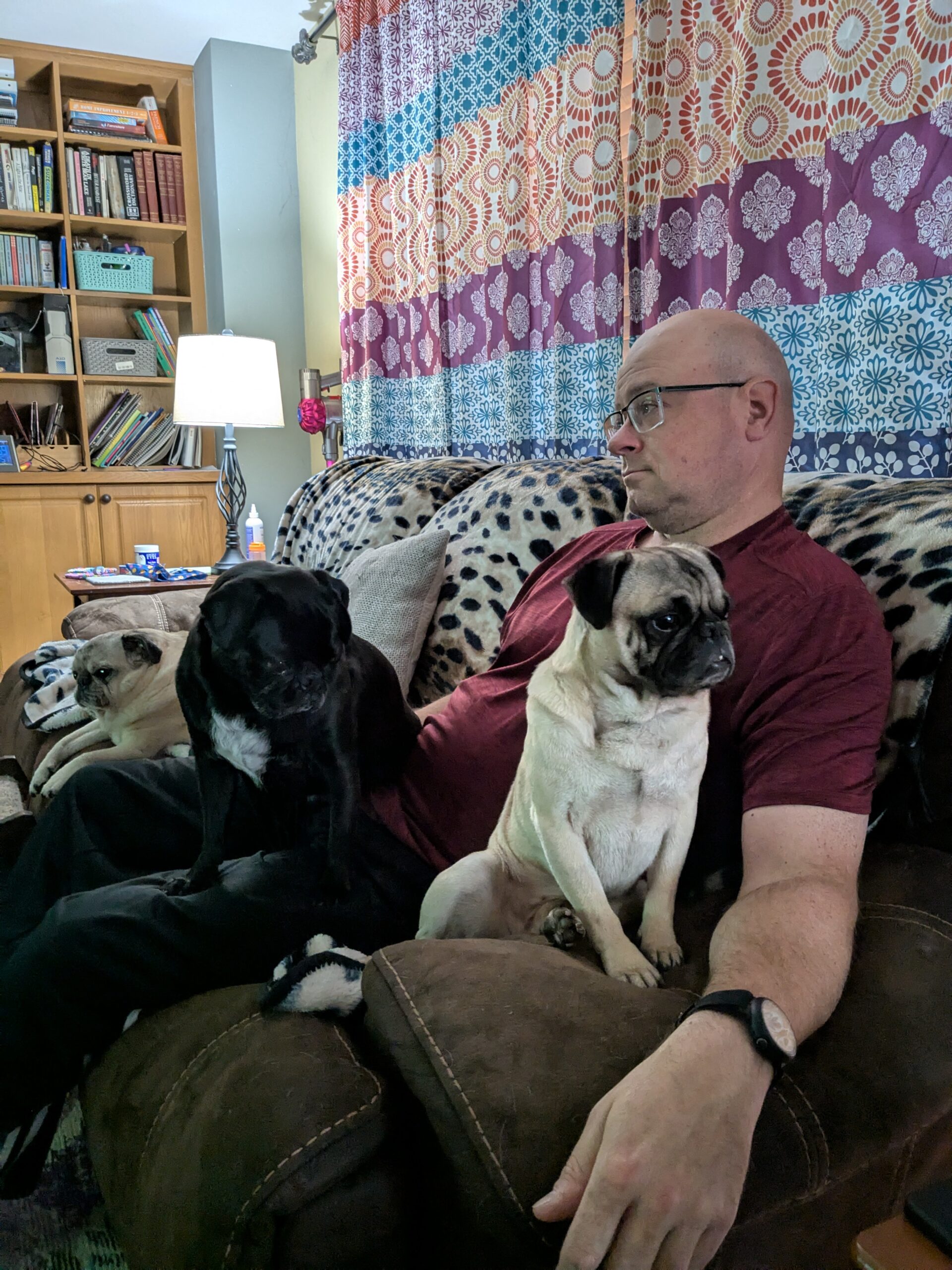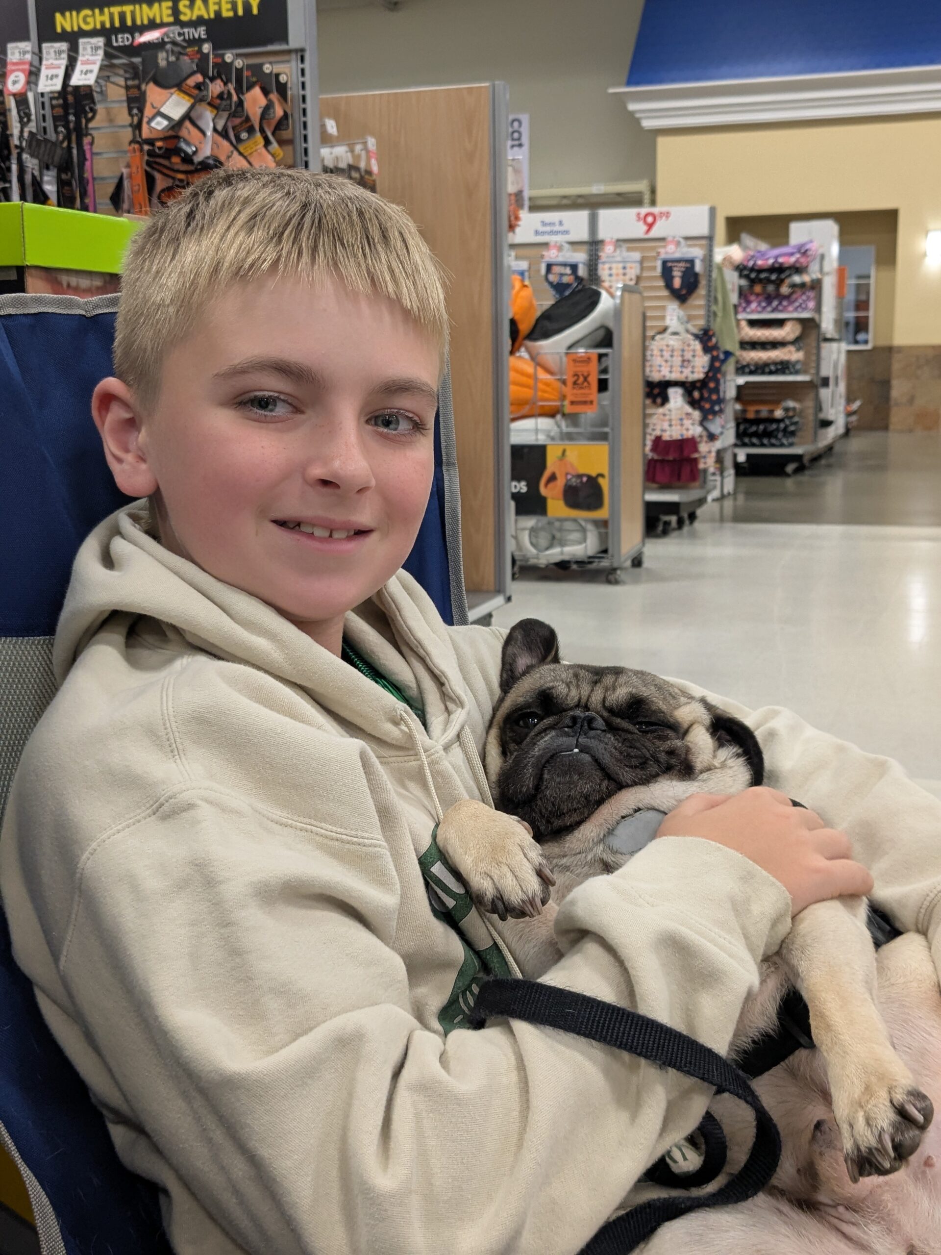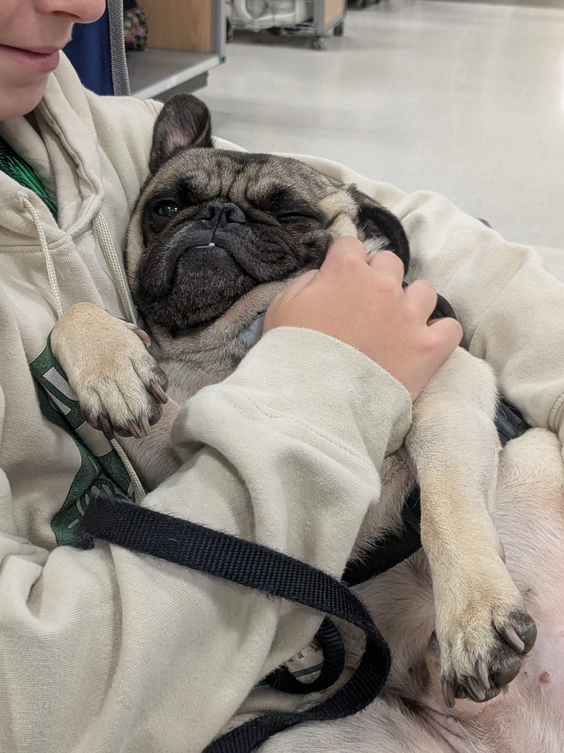 Chucky is a 4-year-old certified good boy with a PhD in Snuggling and Snack Detection. This sweet, calm, easy-going pug is the kind of guy who just wants to hang out by your side, binge-watch whatever you’re watching (he’s not picky), and maybe sneak in a belly rub or three. He gets along wonderfully with other dogs, loves kids, and has the mellow personality of a dog who’s just happy to be part of the family—whether it’s two-legged or four.