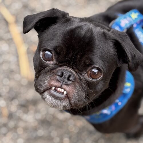 This adorable Pug girl is ready to wiggle her way right into your heart. She’s got everything going for her—sweet, cuddly, great with other dogs, loves kids, and a face that melts even the hardest hearts.