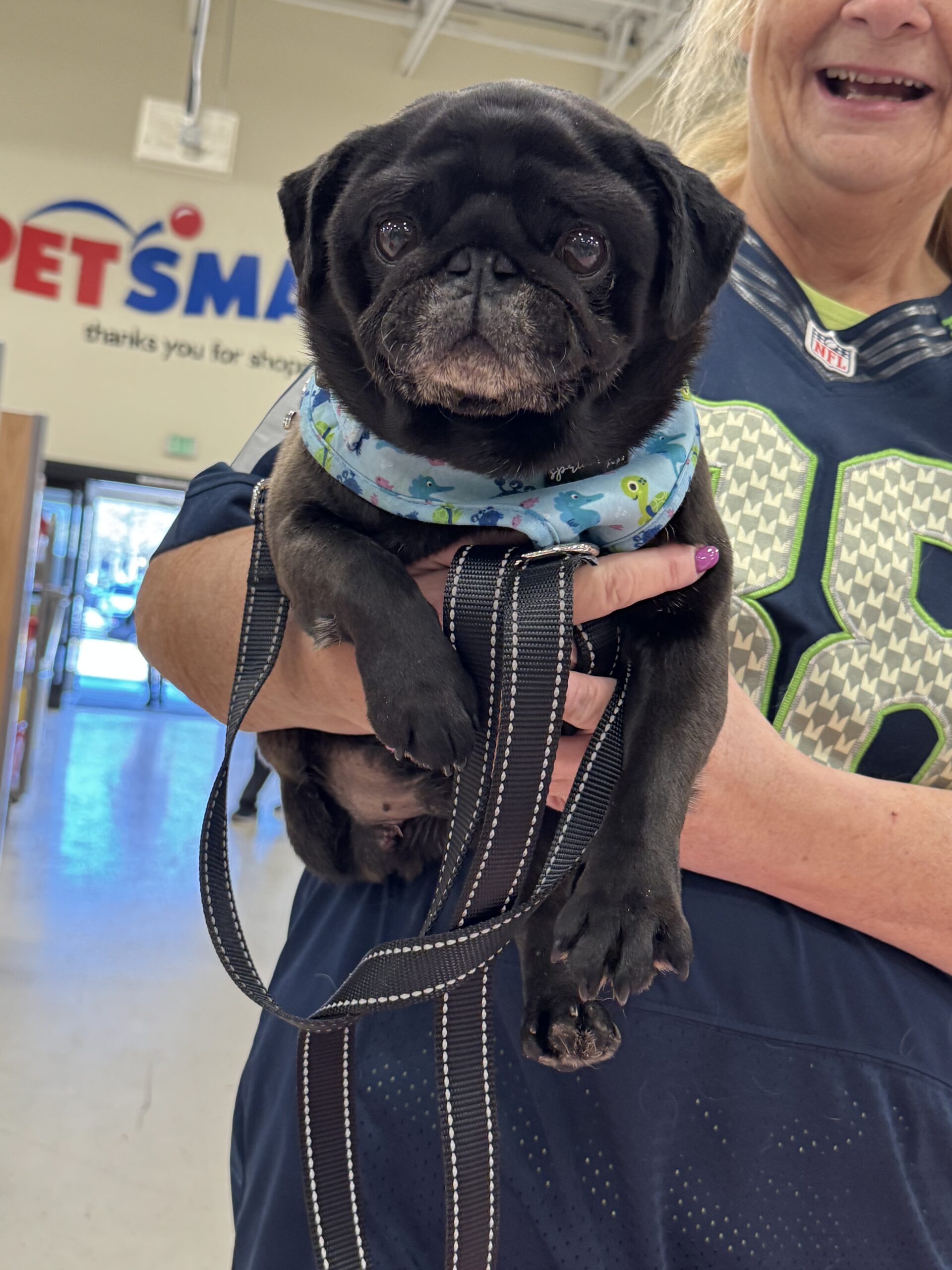 Hans has just arrived to Church of Pug and is settling in his foster home.  He attended a meet and greet adoption event at Petsmart and was such a sweet little man!  Loves everyone and any other dog he met!