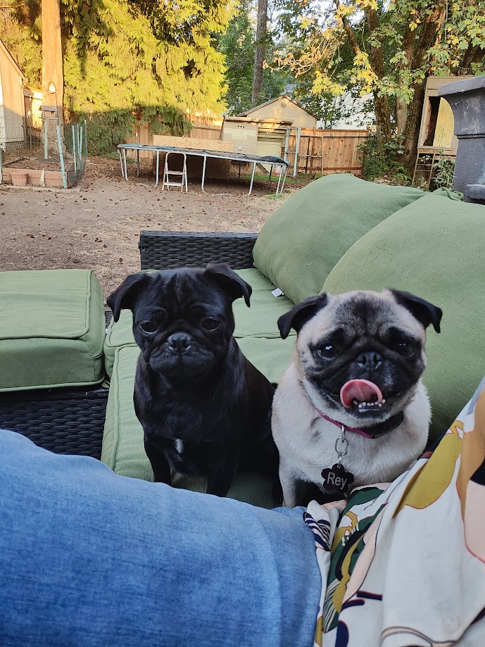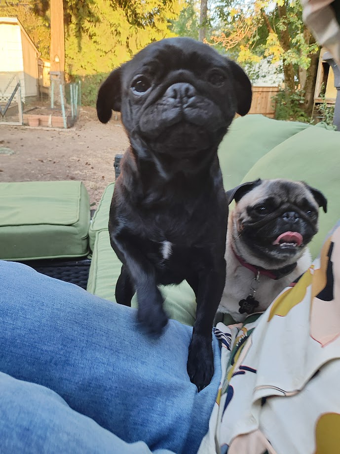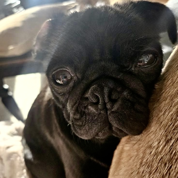 Meet Bella (officially Izzybella, but she’s too sweet not to have a nickname)! This little lady is the definition of a shadow pug — wherever you are, she’s happily right by your side. She’s calm, gentle, and loves nothing more than snuggling up close for cuddles.