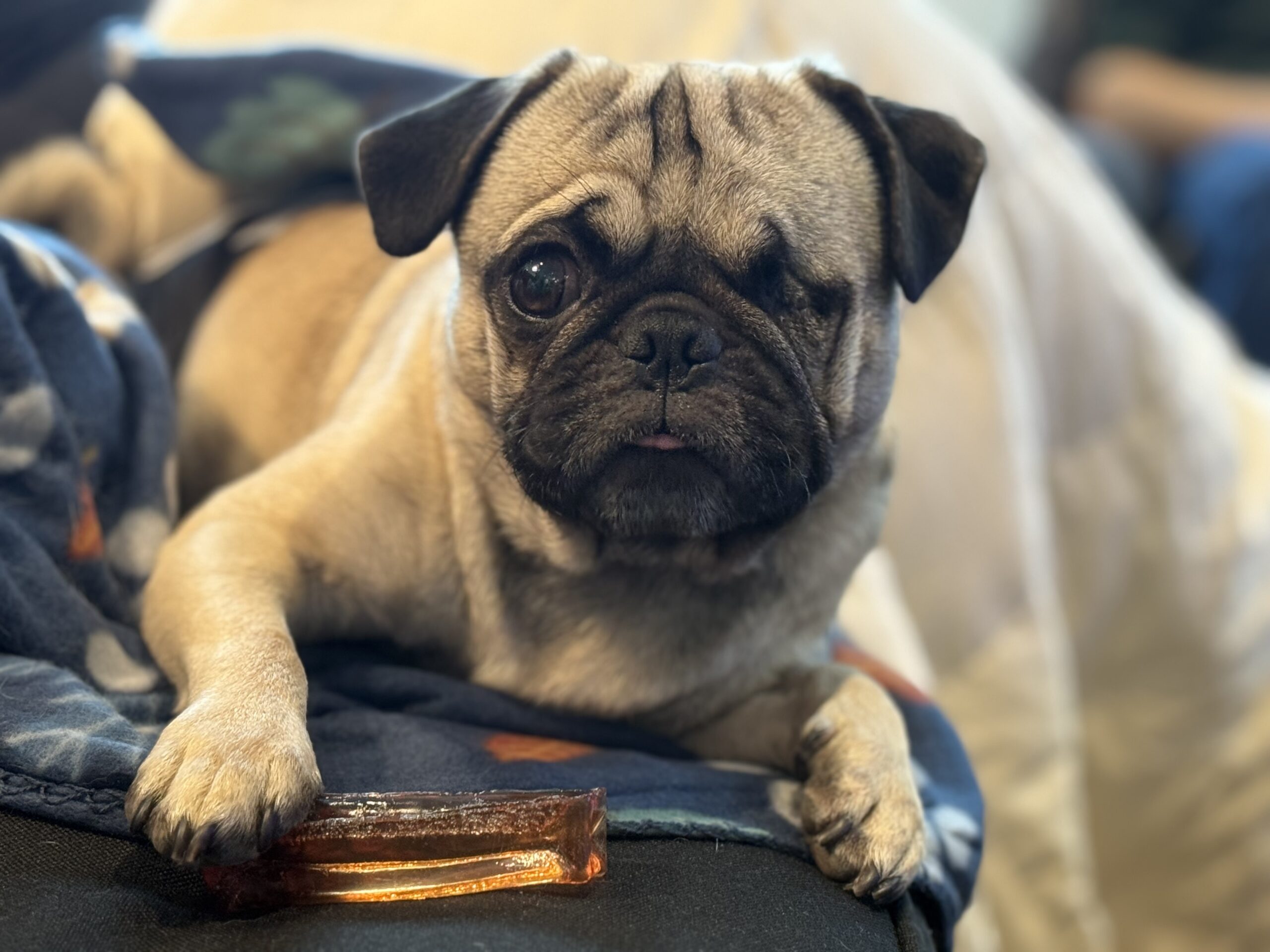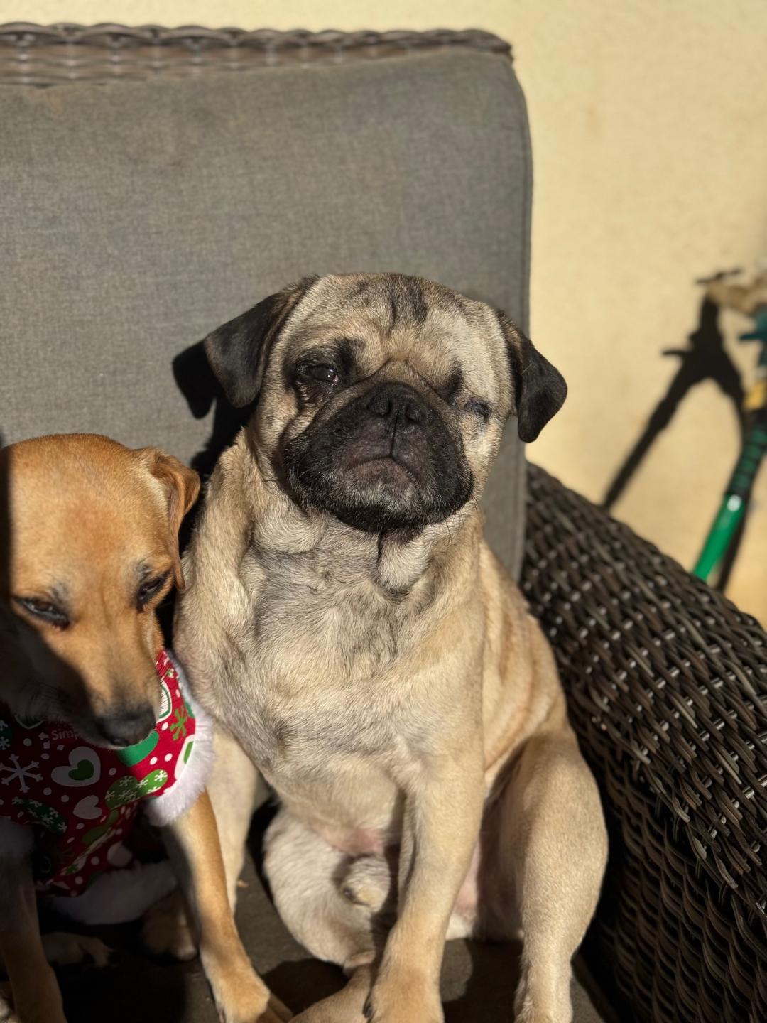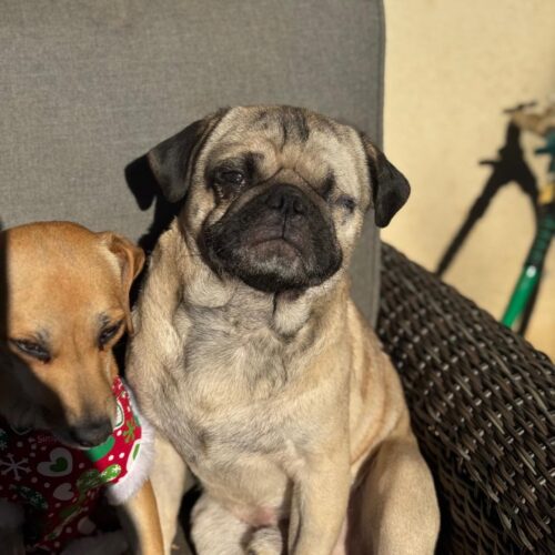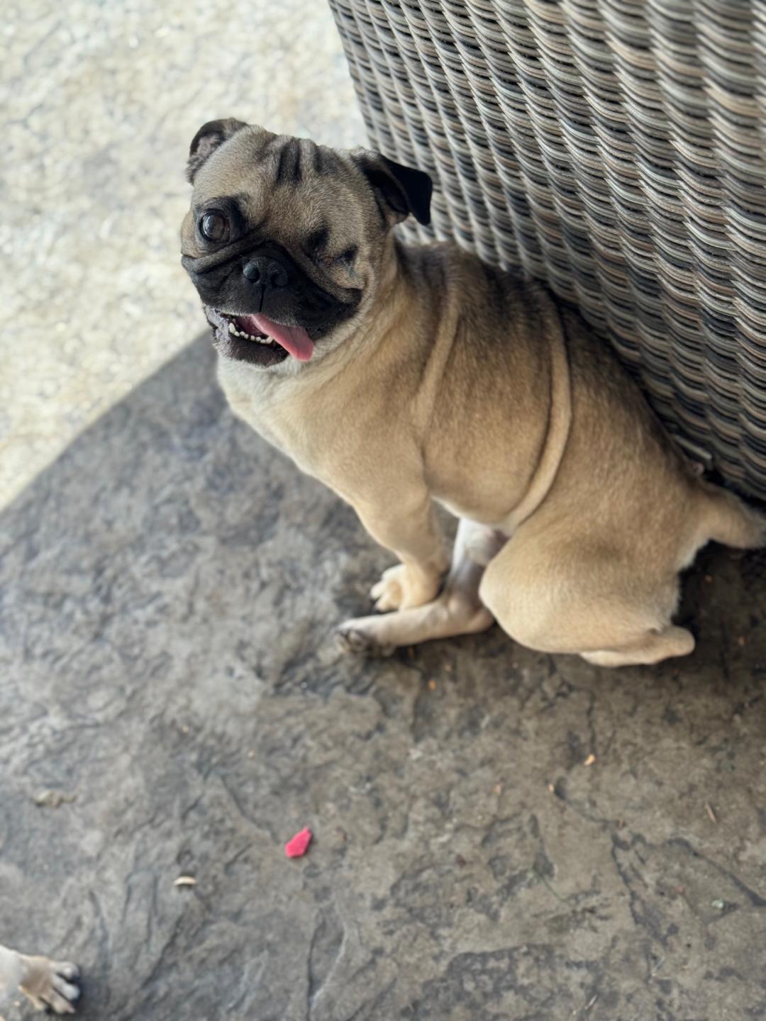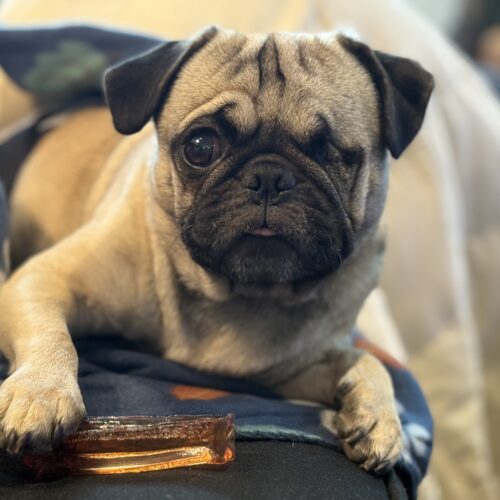 One-Eyed Jax is a smaller-sized pug with a signature sweet side-eye and a heart full of joy. He loves the park, adores other dogs, and plays with all the enthusiasm of a young pup who knows how to have fun.