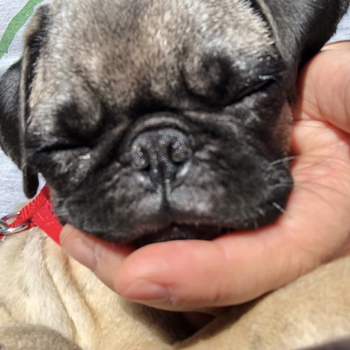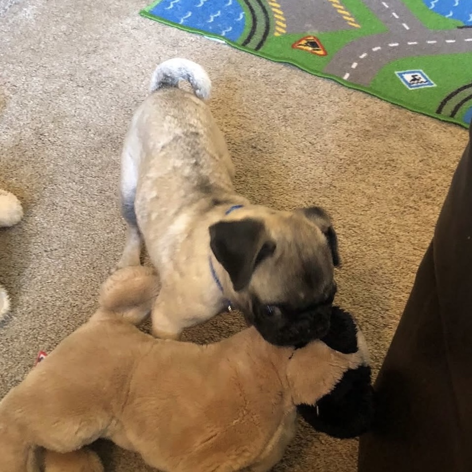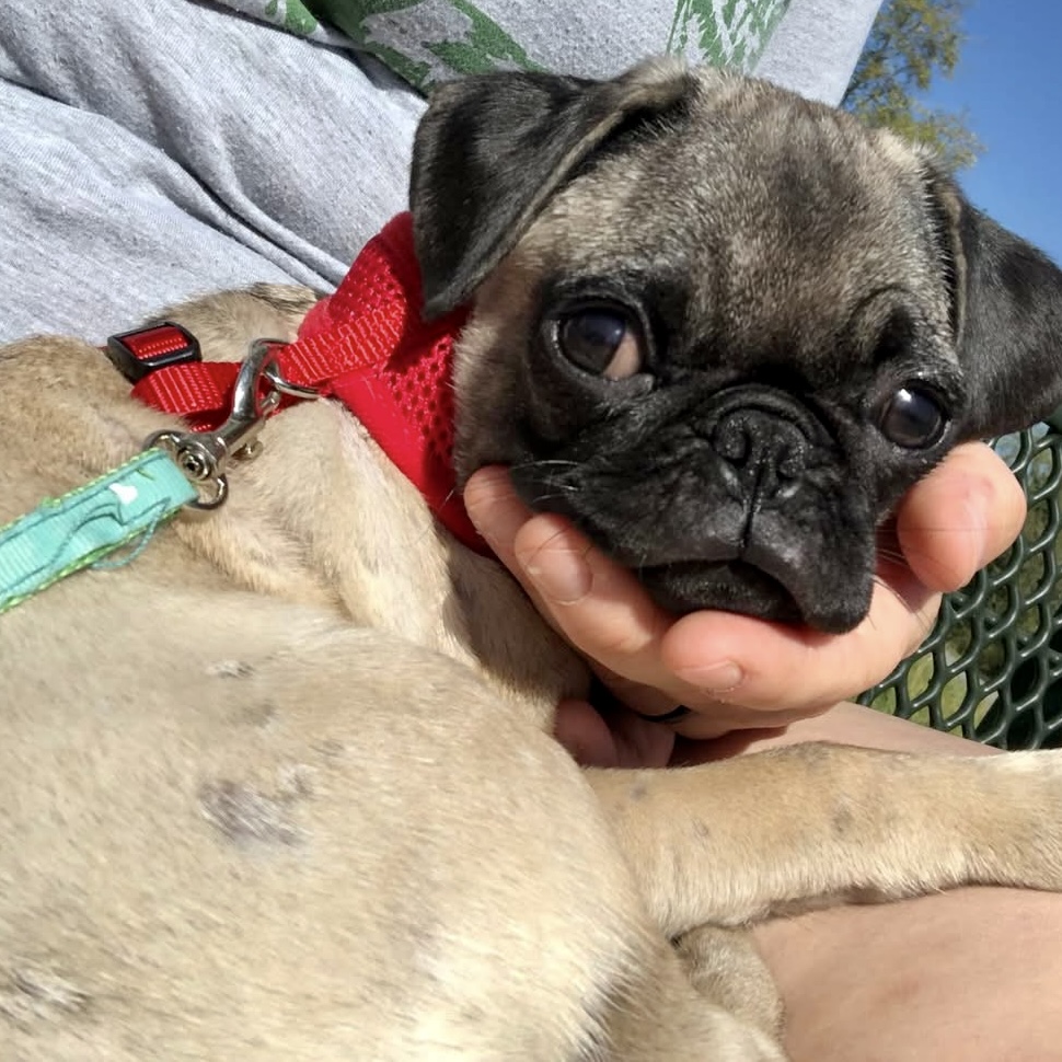 Hey there, I'm Linus! I'm a young, tiny thing but actually a very easy puppy! ! sleep all night in my crate, am doing very well with going potty outside or on my pad by the door, and I'm a ferocious eater and cuddler! I sure love other dogs and would love another friend to play and snuggle with. I love to chase the kids around, wrestle my stuffies and nap on my person's shoulder. I'm great in the car and pretty good on a leash! I like to play hard when I first get up but when I'm out and about l'm actually quite calm in new places and with new people. I might make a great office buddy? My fur is still growing back in, but you can see i have a lovely fade of black up my face and a stripe down my back. I'm smart and friendly and the right mix of fun and chill. Hope to meet you soon