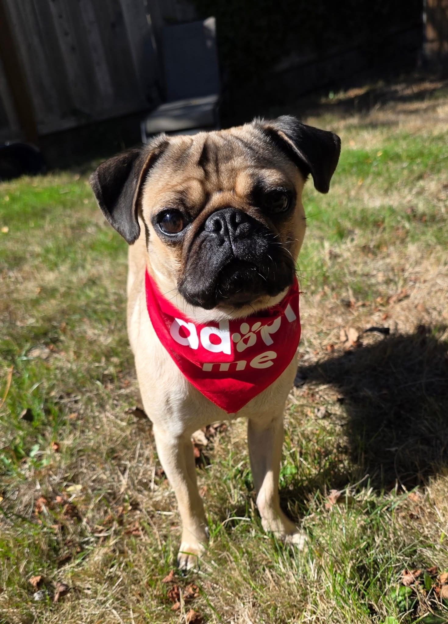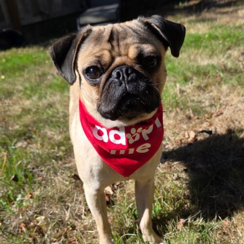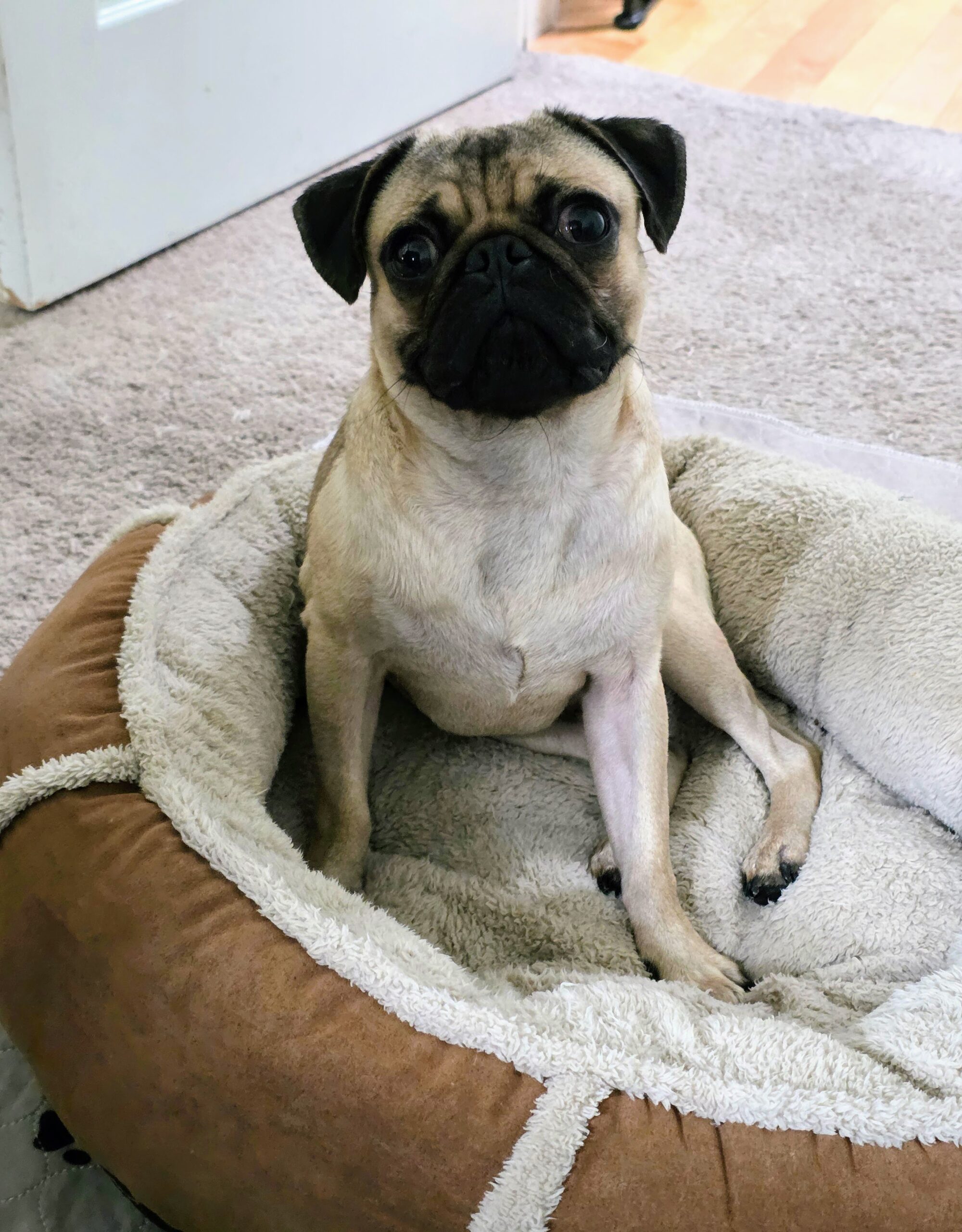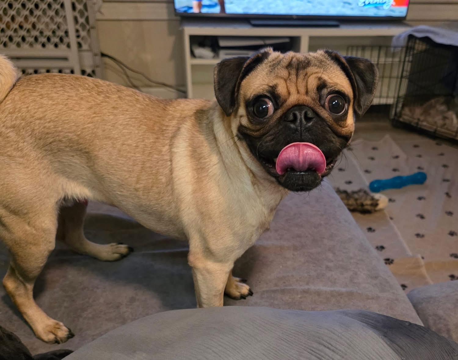 Hi, my name is Max! If you've been searching for a sweet, silly, wigglebutt to be your new furry best friend - congratulations, you've found me! I'm a young pug who loves playing with with toys, giving kisses, and exploring the world and meeting new people. I love *everybody* - grown-ups, kids, other dogs .. even cats! I came to Church of Pug as an owner-surrender, but their loss could be your gain. My Foster Mom says I'm the absolute BEST BOY. I know not to go potty in the house and haven't had a single accident since I've been here. I also sleep quietly without a fuss in my crate throughout the night. When my Foster Mom goes to work, she gives me a lick-it mat with peanut butter, which I eat happily and then curl up in my bed for a nice nap until she gets back. I like it here, but I cannot wait to find my forever family! Could that be you??