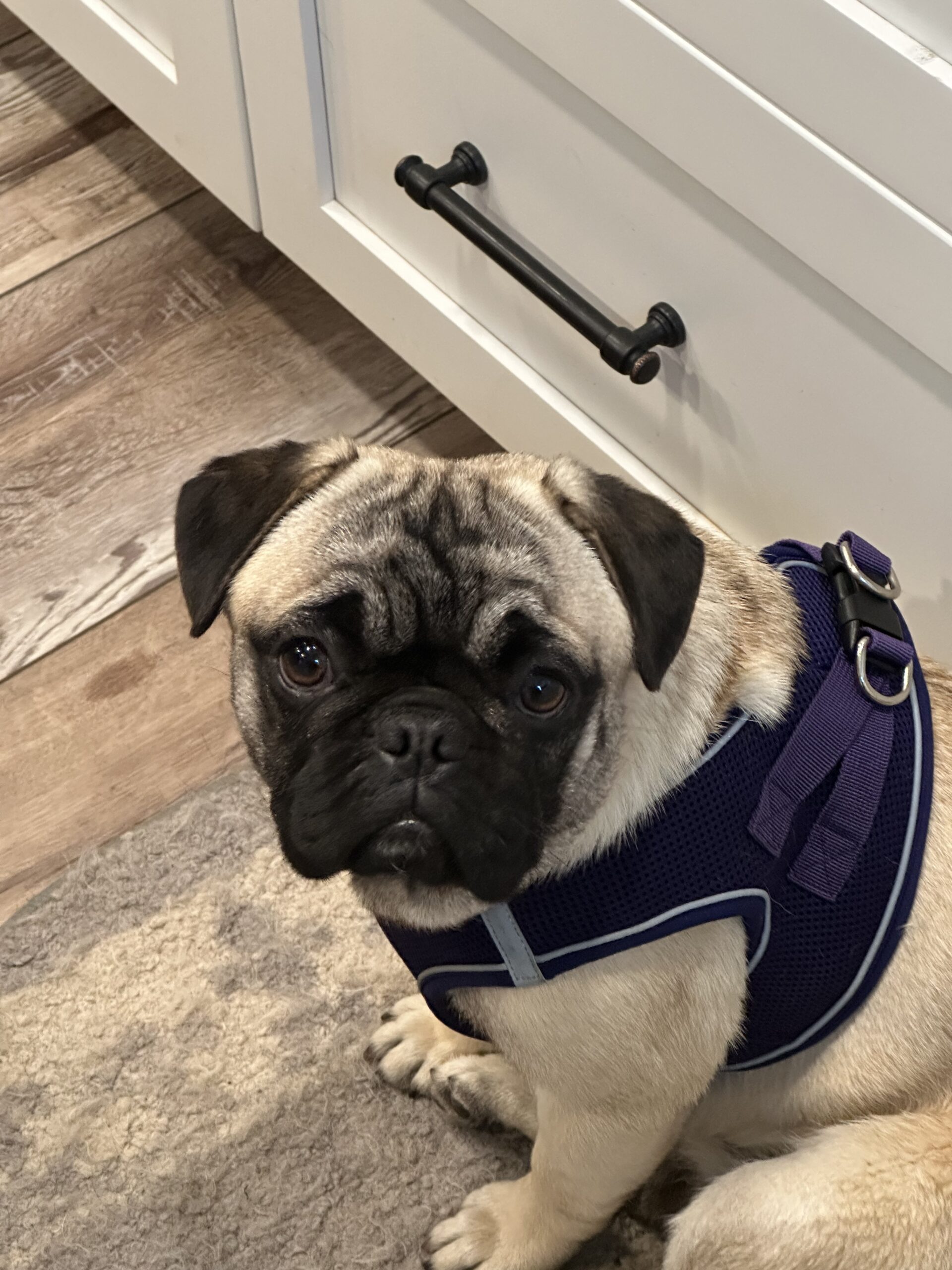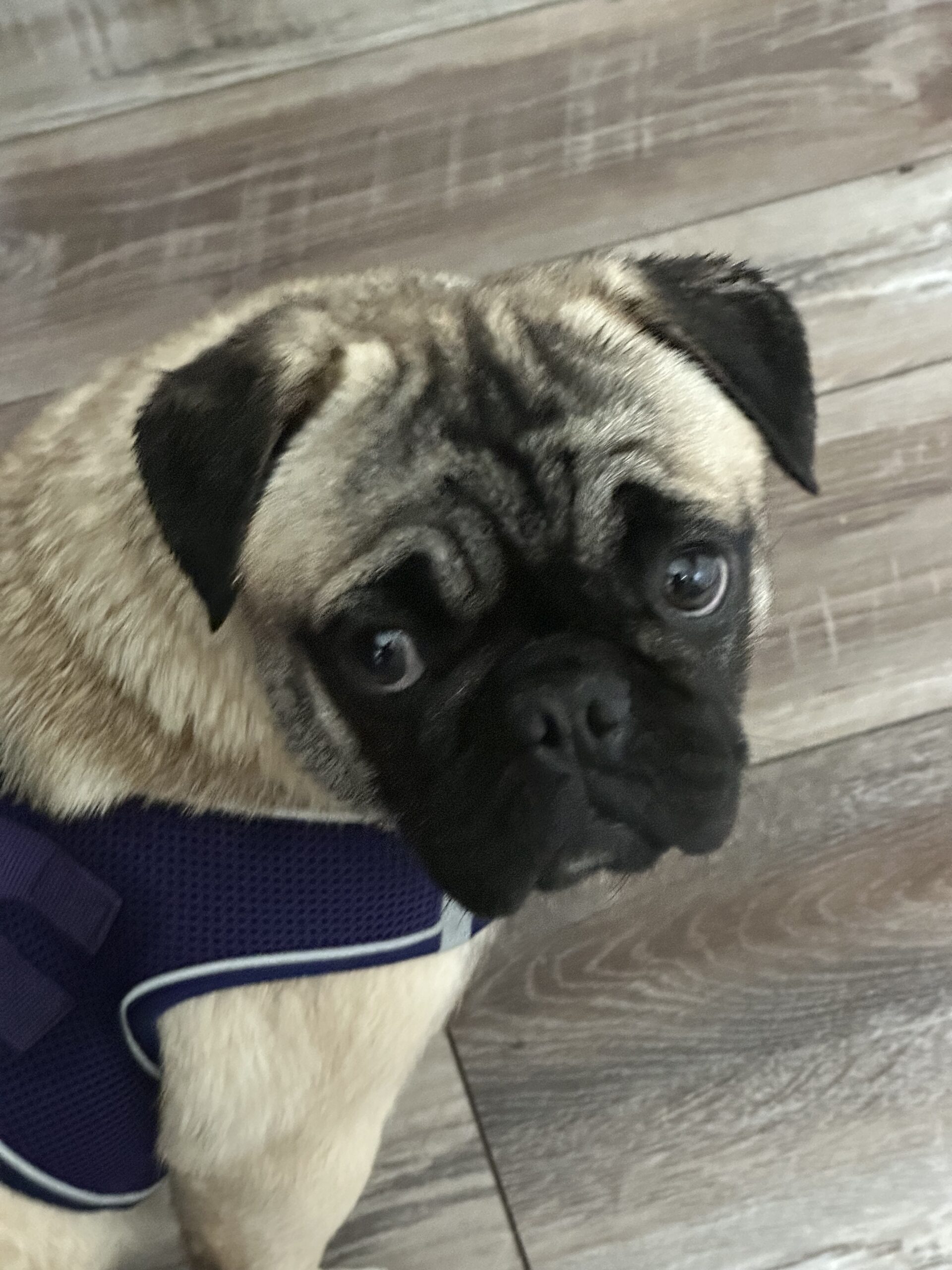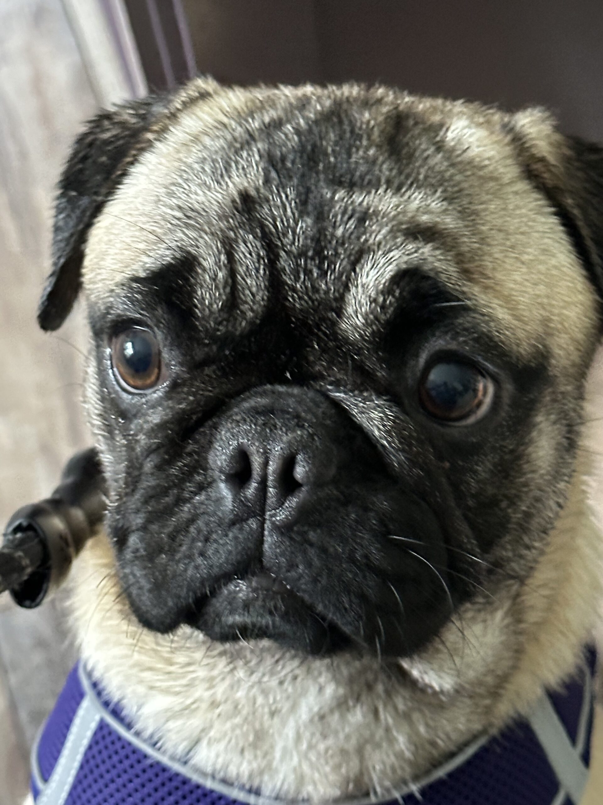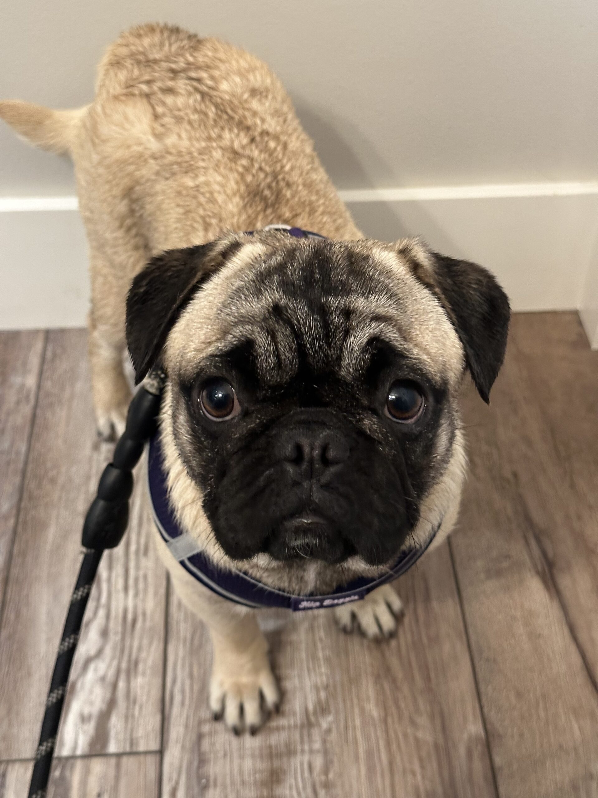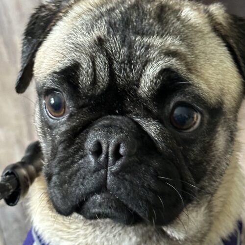 Poundcake is a medium energy girl, playful but also snuggly. When you pet her, she leans her head in and just soaks it up. She gets along with the other dogs in her foster home and is curious but not overly excited by the two cats living there. Poundcake is working on crate training and potty training in her foster home. She is absolutely darling, and is on the taller side for a pug - this girl can leap! If you like a more athletic pug, she’s your girl! Walking buddy? She’s in, as long as there is a nap after.